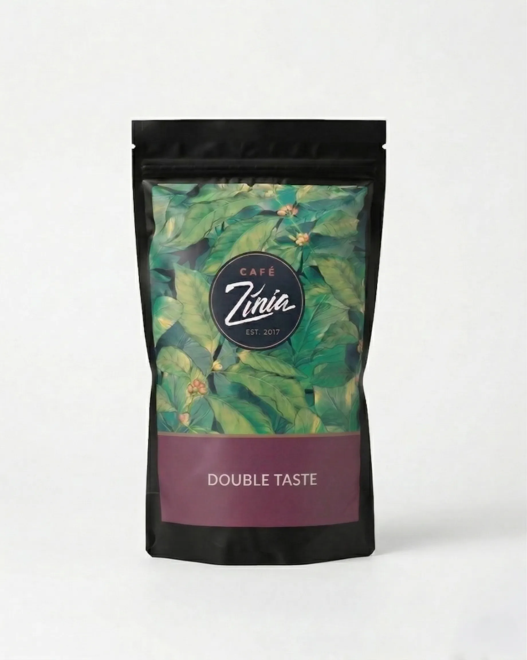 Cafe Zinia Double Taste to harmonijne połączenie dwóch gatunków ziaren - 50% Arabiki i 50% Robusty. Ziarna Arabiki pochodzą z Brazylii, natomiast ziarna Robusty z Indii. Kawę charakteryzuje głęboka owocowa słodycz, wyczuwalne nuty czekolady i orzechów. W zdecydowana w smaku mieszanka, a tkwiąca w niej idealnie zbalansowana moc stanowi skuteczny sposób na szybki przypływ energii.